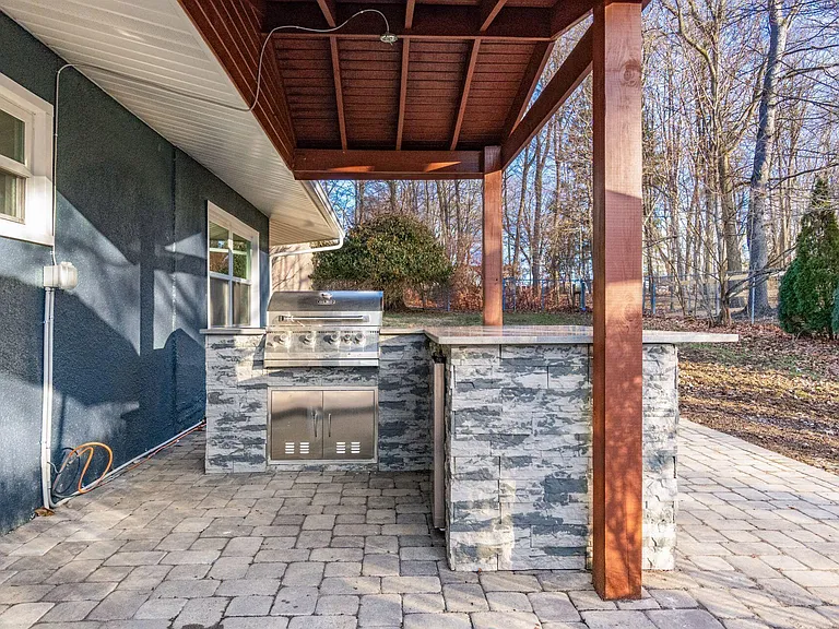 Indoor and outdoor living connect seamlessly through side French doors leading to an outdoor bar and kitchen area, ideal for entertaining. At the front of the home, a dedicated seating area with fire pit overlooks the Scioto River.